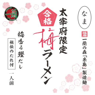 「合格」にちなんで59cmの長さに仕上げた特製合格麺と、太宰府の象徴である「梅」の風味が爽やかなスープを合わせた、縁起の良いご自宅用ラーメンです。一蘭ではとんこつラーメンの美味しさを追求するために様々なラーメンを日々研究開発しております。その過程の中で、福岡・太宰府に根差した味を開発しました。一蘭お馴染みの秘伝のたれや、一蘭の森糸島で製造した特製生麺の合格麺とともに、梅の風味を感じながらご賞味ください。