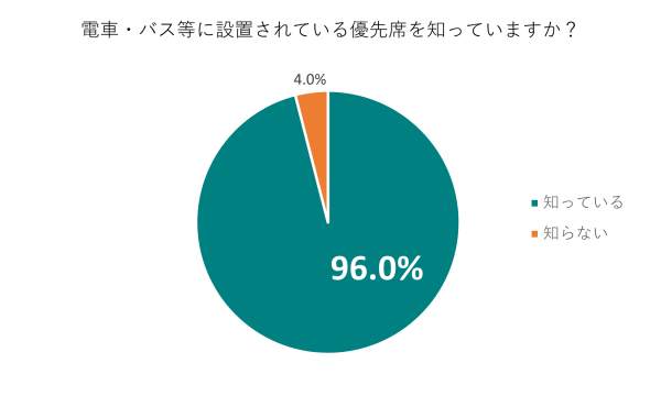 今回実施したアンケート調査では、96%が公共交通機関の優先席を知っていることが明らかになりました。しかし、内装・設備で優先席エリアと通常エリアとの違いを認識している人の割合が少ないこともわかりました。