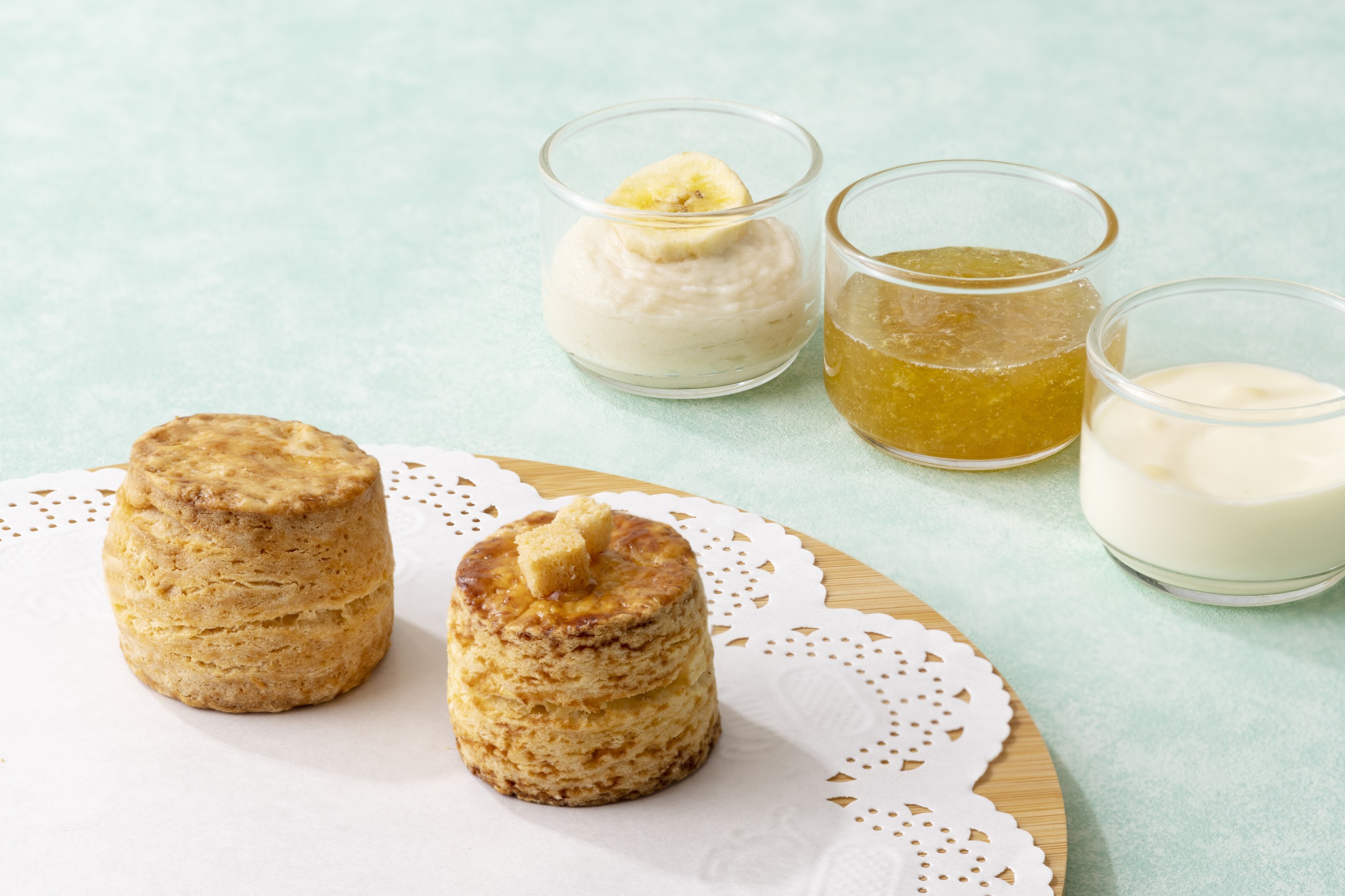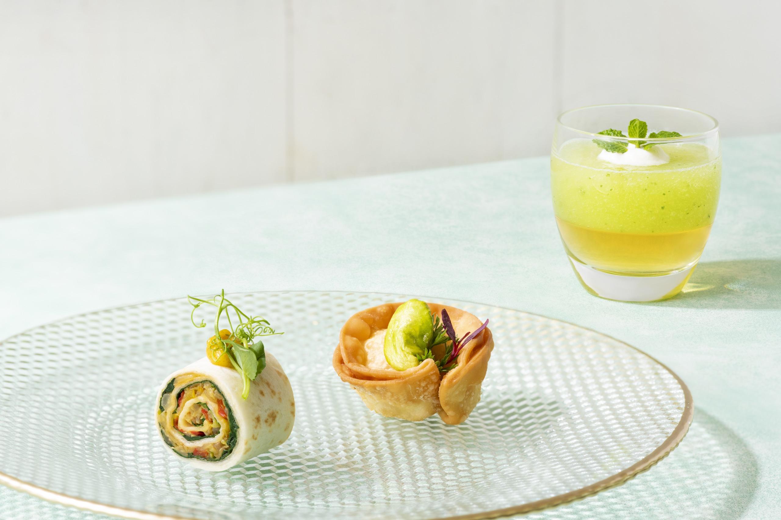 セイボリーには、マスクメロンをソーテルヌワインのジュレと合わせた香り高いメロンスープや、野菜のシャキシャキした食感とチャットマサラのスパイシーなテイストが食欲をそそるラップロールが登場。その他、そら豆と鶏肉のミンチ、クリームチーズなどを合わせて包んだ揚げ餃子や、ミントが上品に香るグリーンピースとマスカルポーネのムースなど、旬の食材を楽しめる6種類のセイボリーをご用意しました。