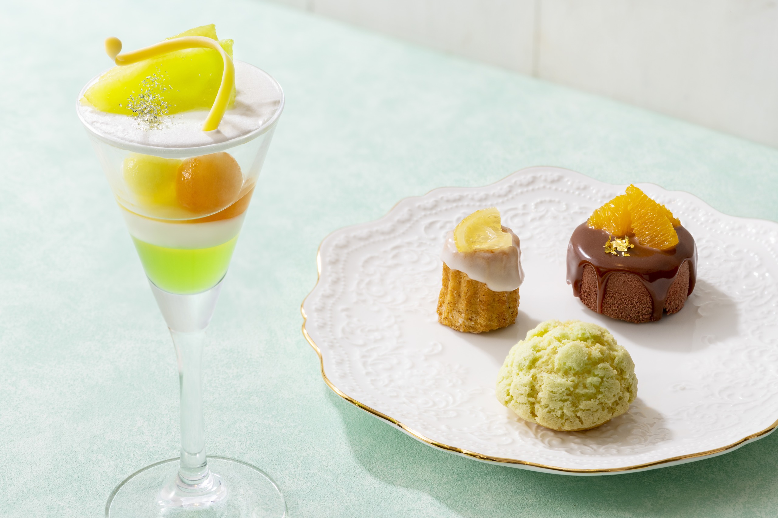 デザートには、赤肉メロンの果肉入りのクラウンメロンクリームをたっぷり絞った、メロンパンのような見た目のシュークリームや、杏仁豆腐とメロンの瑞々しい食感がさわやかなメロンパフェをご用意いたしました。その他、ヴァローナ社の上質なチョコレートを使用したムースにオレンジクリームを忍ばせたチョコレート好きには堪らない一品や、ゴーダチーズの生クリームをトッピングした、大人のスフレチーズケーキのタルトなど、8種類がラインナップ。