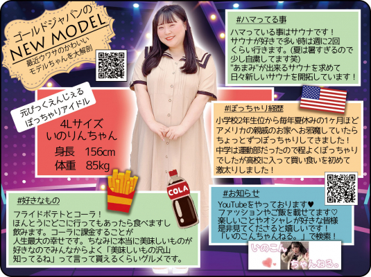 元びっくえんじぇるのぽっちゃりアイドルという肩書きを持ち、TV出演も果たしているいのりん。現在も、ゴールドジャパンのモデルとしても絶賛活躍中です。