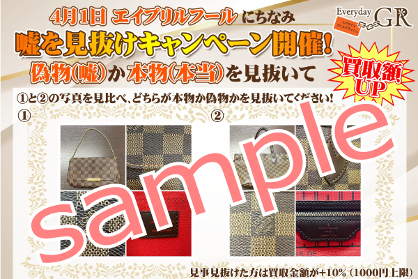 4月1日のエイプリルフールとは、一般的に、“罪のない嘘をついてもいい”という欧米発祥の風習の日ですが、エブリデイゴールドラッシュのバイヤーの中で、“正規品に模倣した偽ブランド品を売買するのは許されざる『嘘』だよね”となり、偽ブランド品の売買は、誰でも懲役10年以下、罰金1000万円以下の刑罰が科される可能性があるということを広く認知し偽ブランド品の売買はやめてほしいとのことで、偽ブランド品の売買に対する啓蒙活動も兼ねて、今回、こちらの『嘘(偽物)か本当(本物)か見抜けキャンペーン』の開催に至りました。
