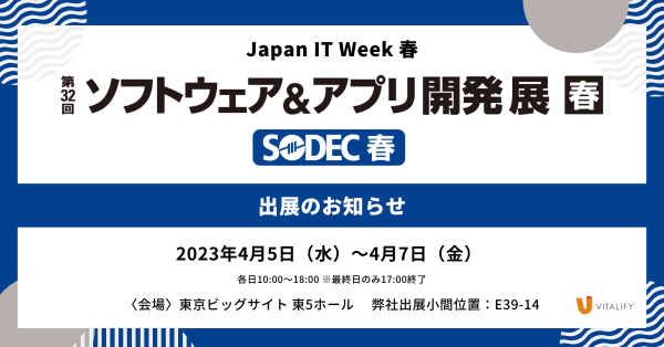 顧客のDX化を総合的に支援するバイタリフィ(東京都渋谷区、代表取締役:川勝潤治)は、2023年4月5日(水)~7日(金)に東京ビッグサイト東ホールで開催される日本最大のIT展示会であるJapan IT Week 春 「ソフトウェア&アプリ開発展」に出展いたします。