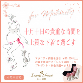 ■キャンペーン内容:マタニティ商品を含む15,000円以上お買い上げの方に「シルクの靴下」をプレゼント