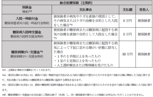 保険期間1年で保険期間中に被保険者が入院したとき、または所定の障がい状態になったときに所定の保険金を支払う医療保険です。糖尿病を原因とする入院については、入院一時給付金に加え、糖尿病入院時支援金をお支払いします。入院には日帰り入院、教育入院を含みます。