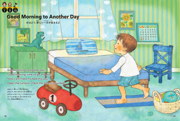 本書に付属のCDに収録されるのは、朝起きた時から日常の遊び、環境問題からバースデーソングまで、多彩なテーマで作られた、子供たちの興味をそそる楽しい楽曲たち。歌詞の世界を描いたイラストと一緒に、親子で楽しみながら、ネイティヴが使う基本的な単語やフレーズを自然と身につけることができます。