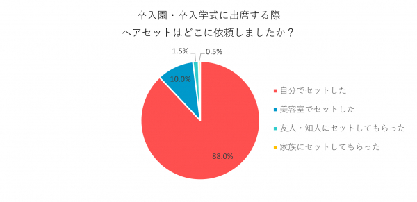 「自分でセットした」が最も多く88%、次いで「美容室でセットした」10%、「友人・知人にセットしてもらった」1.5%、「その他」0.5%という結果でした。