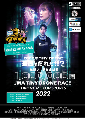 国土交通省ドローン登録講習機関であるJMA(正式名称:一般社団法人日本マルチコプター協会 本社:東京都千代田区丸の内1-11-1 パシフィックセンチュリープレイス丸の内13階、代表理事:工藤政宣)は、『ドローン普及活動×地域活性化プロジェクト』の一環として、2023年3月25日(土)、岡山奉還町商店街にて開催致しました「JMA TINY DRONE RACE 2022」(以下、本大会)第7戦OKAYAMAの結果を発表致します。