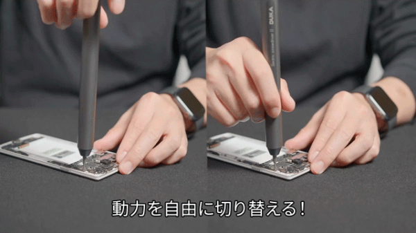本体はわずか60gと電動ドライバー離れした超軽量設計。ペンのように握れるスリムなボディで、バツグンのグリップ感を誇ります。