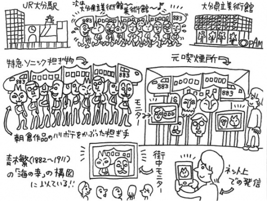 人々より募った古着や新聞、ダンボールを素材として約10メートルの「特急ソニック」の担ぎ物を制作。朝倉文夫の彫像の頭部を模したハリボテを被った十数人の担ぎ手が大分の各場所へとねり歩く状況を録画した映像はJRのガラス張りの空間に制作物と共に設置されたモニターに映し出される。映像はネット上や街中のモニターでも放映され視聴者の拡大とともに作品は現象として広がり続ける!!?