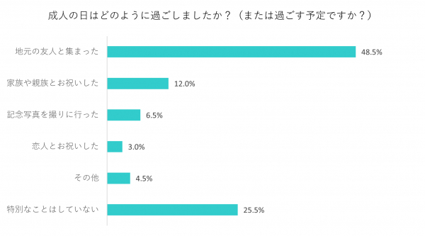 「地元の友人と集まった」48.5%、「家族や親族とお祝いした」12%、「記念写真を撮りに行った」6.5%、「恋人とお祝いした」3%、「その他」4.5%、「特別なことはしていない」25.5%という結果でした。