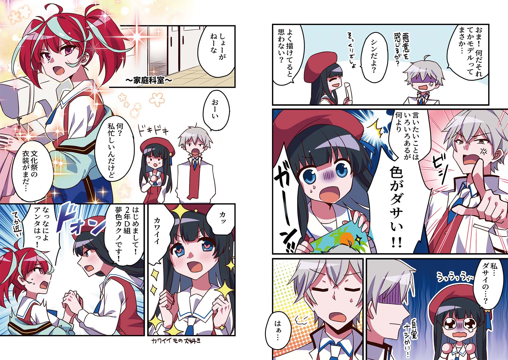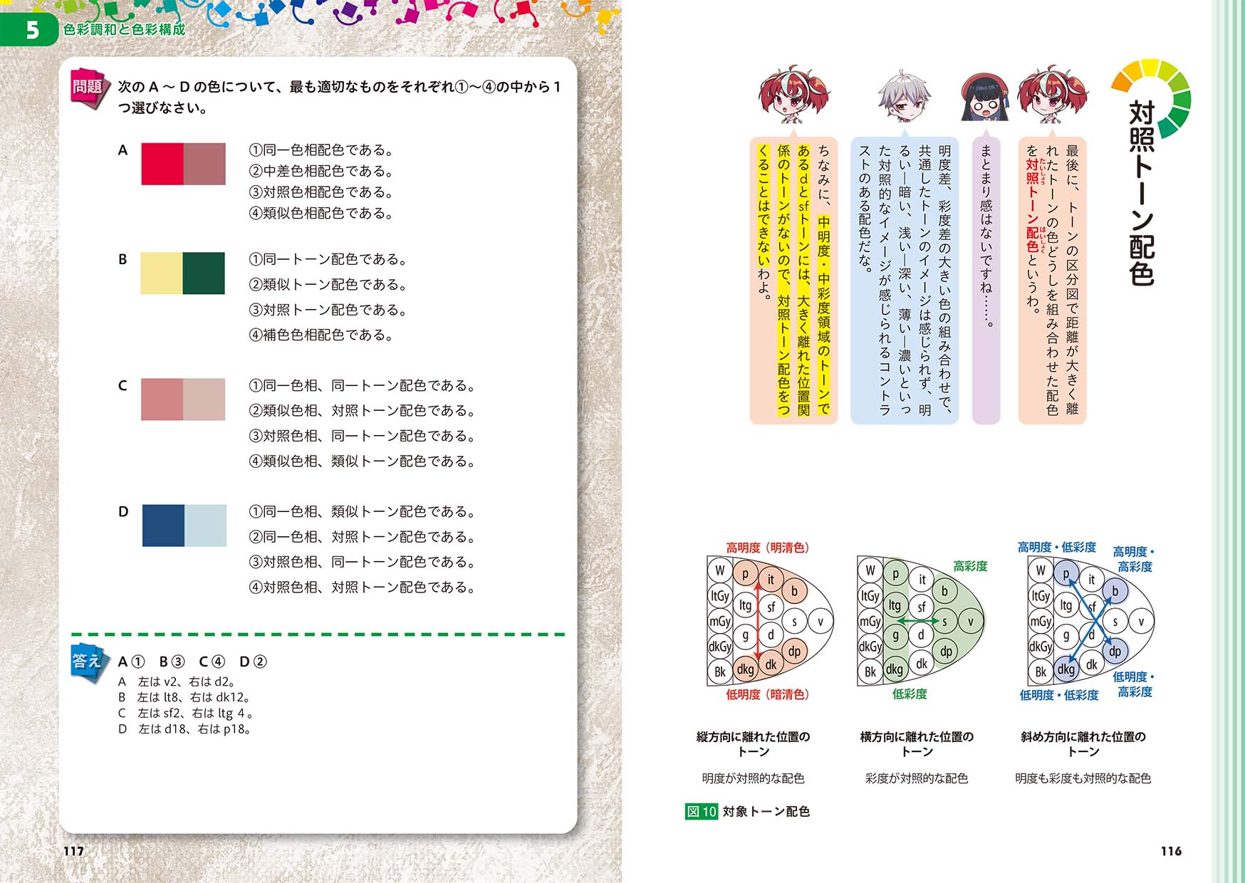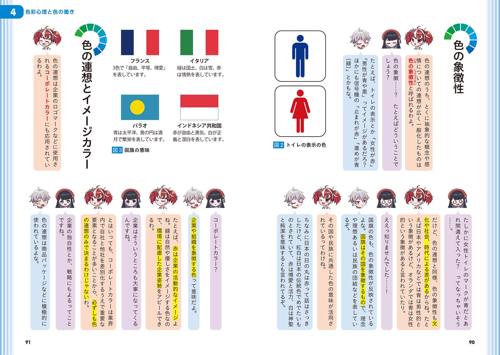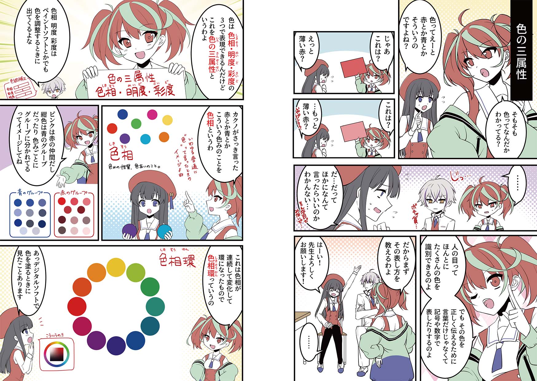 まんがページ以外にも、キャラクター同士の会話で色彩検定について解説していきます。