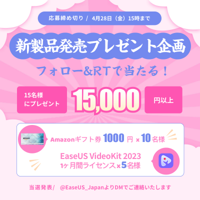 プレゼント:(1)Amazonギフト券1,000円x10 (2)EaseUS VideoKit 一ヶ月間ライセンス x5