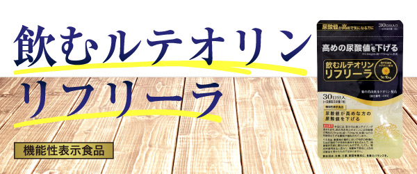 プリン体から尿酸が作られる過程の「キサンチンへの変換」「尿酸への変換」の2カ所で阻害し、尿酸が過剰につくられるのを抑制する事で、高め(5.5mg/dl超~7.0mg/dl未満)の尿酸値を下げるはたらきが期待される菊の花由来ルテオリンに、田七人参を贅沢配合し、機能性表示食品「飲むルテオリン リフリーラ」を開発しました。