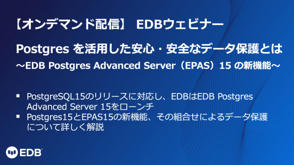300名を超すPostgreSQL技術者でPostgres専門ベンダーとして世界をリードするエンタープライズDB(EDB)は、「Postgresを活用した安心・安全なデータ保護とは ~EPAS 15の新機能~」と題するウェビナーのオンデマンド配信を本日より開始いたしました。