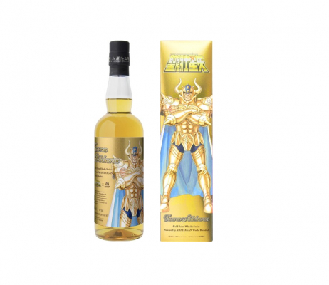 この「聖闘士星矢 ゴールドセイント ウイスキーシリーズ」では、黄金聖衣を纏った彼らの雄姿を描いた黄金のラベルと化粧箱が煌びやかに輝きます。過去の商品に引き続いて第6弾は、発売日である5月16日の星座で、黄金聖闘士の中でも無双の剛を誇り、「黄金の野牛」の異名をもつ「牡牛座(タウラス)のアルデバラン」です。これ以降も、各月ごとにリリースを予定しておりますので、今後の展開にもご期待ください。