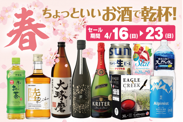 全国に189店舗で酒の専門店をチェーン展開する株式会社リカーマウンテン(本社:京都市)は、4月16日(日)~23日(日)の8日間、深夜営業店舗を除く一部店舗で「春 ちょっといいお酒で乾杯!セール」を開催いたします。