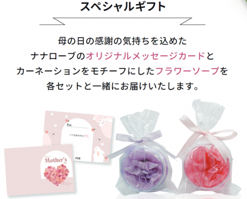 母の日の感謝の気持ちを込めたナナローブオリジナルメッセージカードとカーネーションをモチーフにしたフラワーソープを各セットと一緒にお届けします。