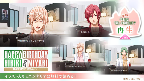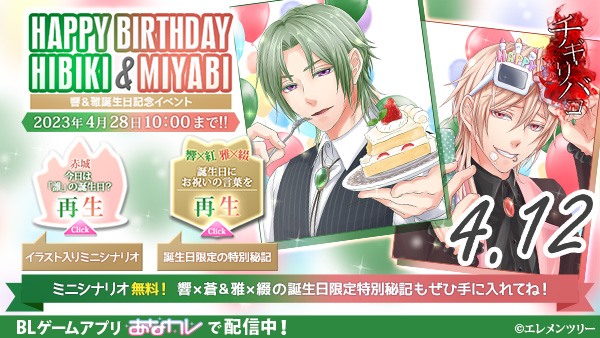 株式会社エレメンツリー(代表取締役:小川 邦弘、所在地:大阪市中央区)は、2023年4月12日にホラーBLゲーム『チギリバコ』響&雅誕生祭イベントの提供を開始しました。