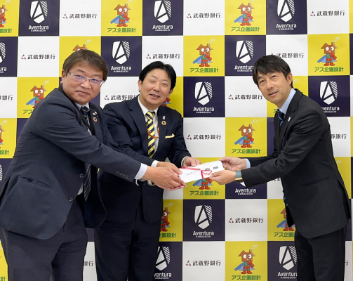 不動産事業を行う株式会社アズ企画設計(本社:東京都千代田区、代表取締役:松本俊人)は、株式会社武蔵野銀行(本店:埼玉県さいたま市、取締役頭取:長堀和正、以下「武蔵野銀行」)を引受先とする「むさしのSDGs私募債『みらいのちから』」を発行し、資金調達を実施しました。また、発行額の一部は武蔵野銀行を通じて、当社がメインスポンサーも務める「アヴェントゥーラ川口」に寄付しており、2023年4月12日に贈呈式を実施いたしました。