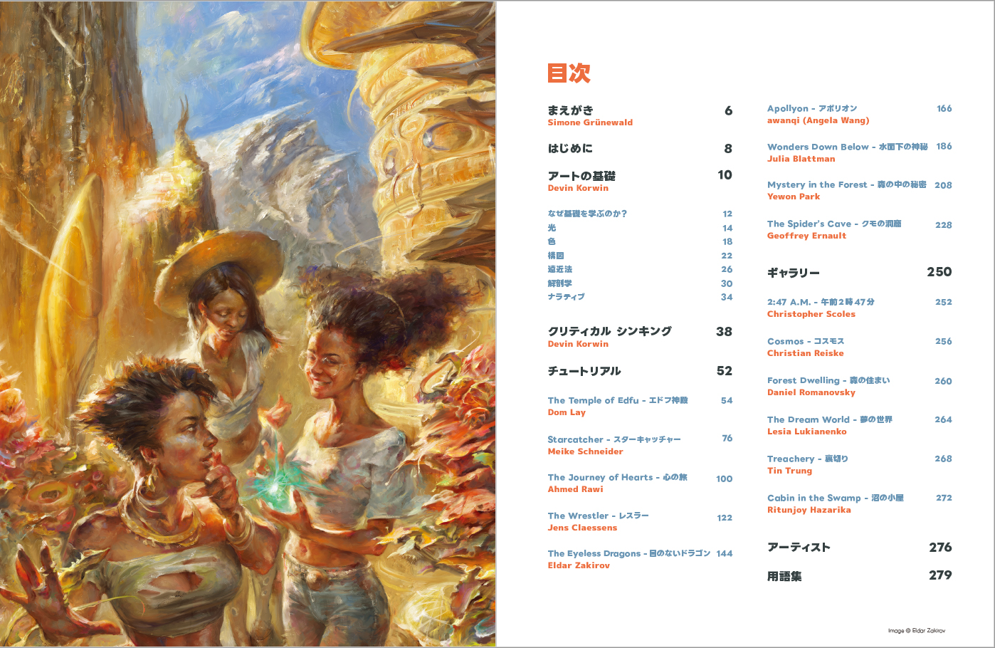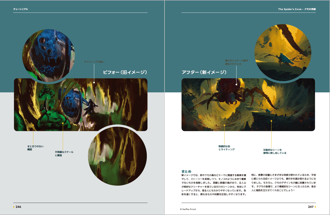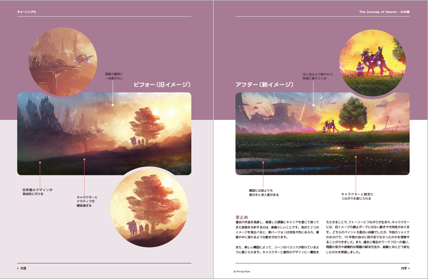 15名の専門家、プロのイラストレーター・コンセプトアーティストたちが、自分の過去作を例にして、どのように間違っていたのか、そして、その改善点を見つける方法を明らかにします。そして、その方法を説明するだけでなく、実際に「アートの原則」を基に改良したリメイク版を披露します。