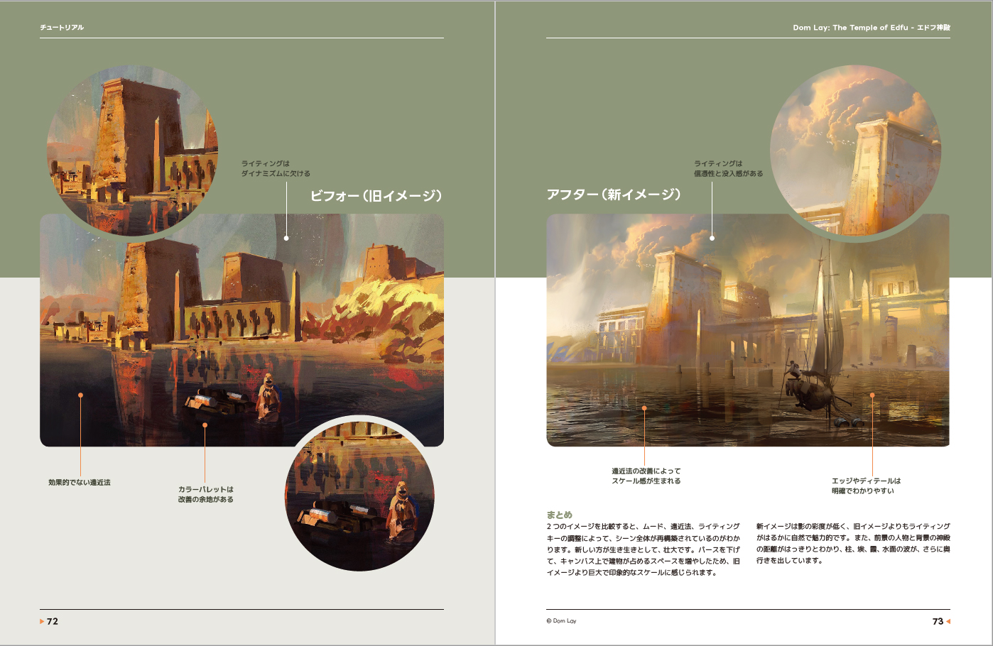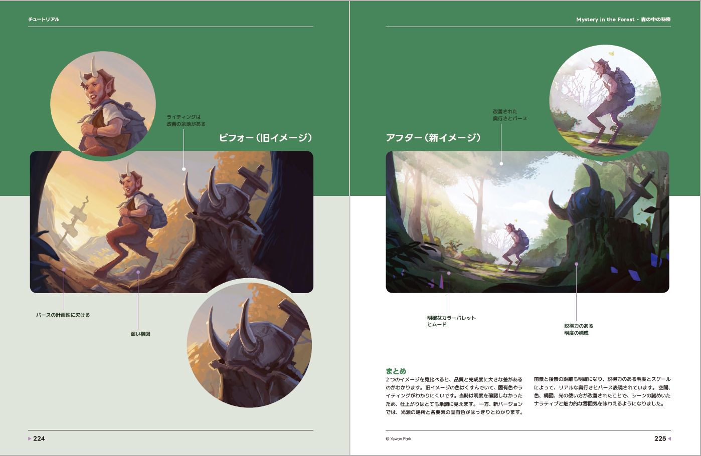 『デジタルアーティストが知っておくべきアートの原則』では、色、光、遠近法、奥行き、構図、解剖学などを取り上げました。本書「ビフォー&アフター」では、自分がどれだけ、それらの「アートの原則」を実践できているかを評価し、問題を特定して、解決できるようにします。