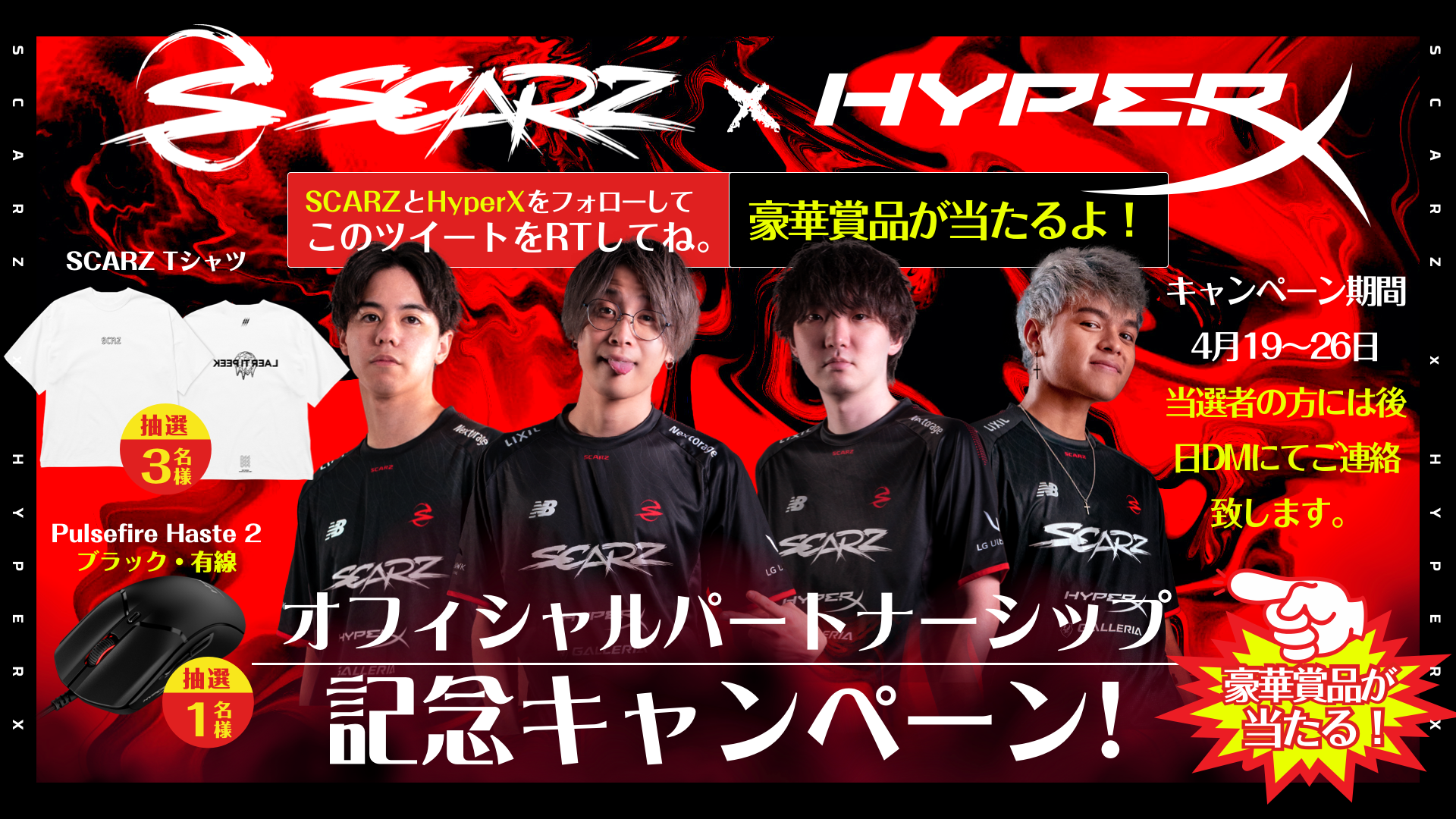 加えて、もうすぐ発表されるパートナーアクティベーションにはHyperXの限定イベント、カスタムビデオ及びSNSコンテンツ、製品プレゼント等へのアクセスが含まれます。また、パートナーシップを祝して、HyperXのSNSアカウントにて現在、SCARZグッズを含む特別プレゼント企画を実施しております。詳細についてはHyperX JapanのTwitterチャンネルをご確認ください。