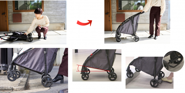 後ろに傾斜した形状で段差や下り坂でも荷崩れしにくく、「足元バー」で段差や坂道もラクラクです。