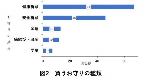 購入するお守りの種類についての調査では、「健康祈願」についてのお守りが最も購入されているということが分かりました。