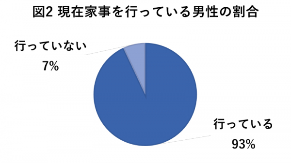 回答者のうち、現在家事を行っている男性は9割以上を占めているのに対し、行っていない男性は1割にも満たない結果に。