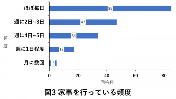結果、週に1回や月に数回行っている男性よりも週に2日以上家事に参加しているという割合が高く、「ほぼ毎日」との回答が最も多くみられました。