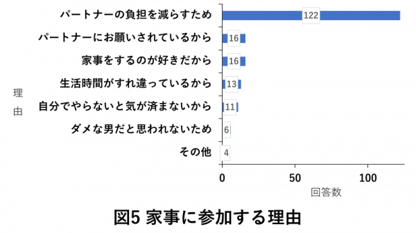 なぜ家事に参加しているのか、家事を行う理由について回答者に伺ったところ、「パートナーの負担を減らすため」という理由が過半数を超えていました。