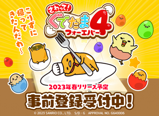 株式会社グッドラックスリー(本社:福岡県福岡市、代表取締役:井上和久)は、株式会社サンリオよりライセンス許諾を受け、ギャザリングホールディングス株式会社(本社:東京都豊島区、代表取締役CEO:戸田和宏)及び株式会社アイモバイル(本社:東京都渋谷区、代表取締役社長:野口哲也)と契約を締結して開発を行った、サンリオの人気キャラクター『ぐでたま』が登場する今春配信予定のスマートフォン向けアプリ『さわって!ぐでたま4~フォーエバー~(以下「本ゲーム」)』の日本語版サービスについて、2023年4月26日(水)より事前登録受付を開始したことをお知らせいたします。