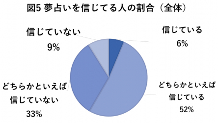 全体における夢占いを信じている割合では、「信じている」「どちらかといえば信じている」との回答が52%、「信じていない」「どちらかといえば信じていない」との回答が33%を占めていました。