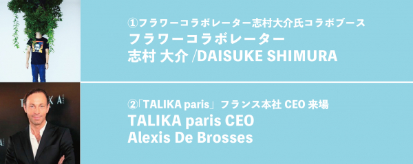 「TALIKA paris」ブースでは、商品展示/販売の他、フラワーコラボレーター「志村大介」氏とコラボし、ブランドイメージを具現化してオリジナルフラワー作品による装飾も施します。
