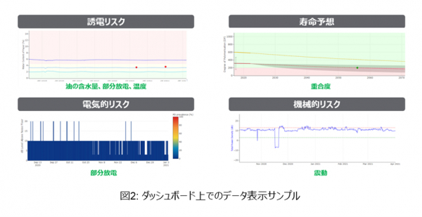水分含有量や温度、環境温度、部分放電(PD)、震動、磁気などのデータを常時取得。クラウド環境のダッシュボードでリアルタイムに監視が可能