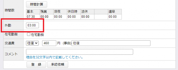 これにより、例えば一日の勤務の中で内勤と外勤が混在した場合に、外勤した時間数を入力する事で外勤の時間数の集計が可能になります。
