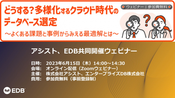 株式会社アシストとエンタープライズDB株式会社は「どうする?多様化するクラウド時代のデータベース選定~よくある課題と事例からみえる最適解とは~」と題する共同ウェビナーを2023年6月15日(木)に開催いたします。