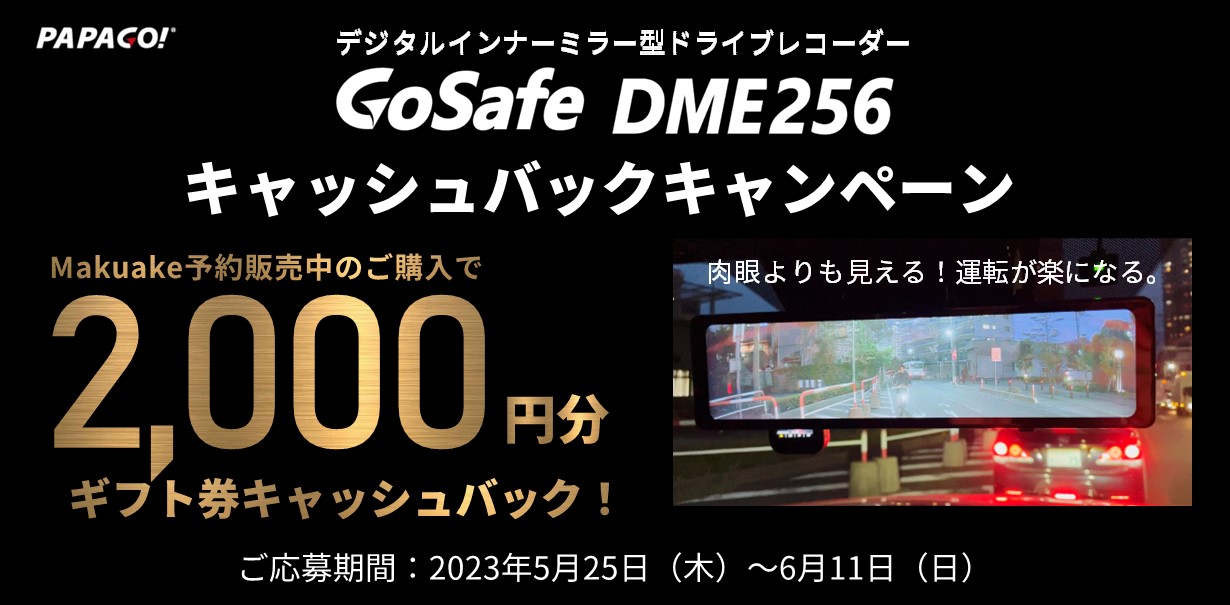 PAPAGO JAPAN株式会社は、先着50名様にデジタルインナーミラー型ドライブレコーダーの買い替えを応援するため「GoSafe DME256キャッシュバックキャンペーン」を2023年5月25日から6月11日まで開催いたします。詳しい内容はキャンペーンページをご覧いただけますでしょうか。