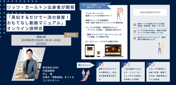 この度、株式会社JEAN(読み:ジーン、業種:研修・コンサルティング、本社:京都府京都市、代表取締役:河上 朗)は、サービス業の企業様に向けて、動画付き接客マニュアル「真似するだけで一流の接客!おもてなし動画マニュアル」作成サポートに関する、オンライン説明会を好評につき、追加開催致します。