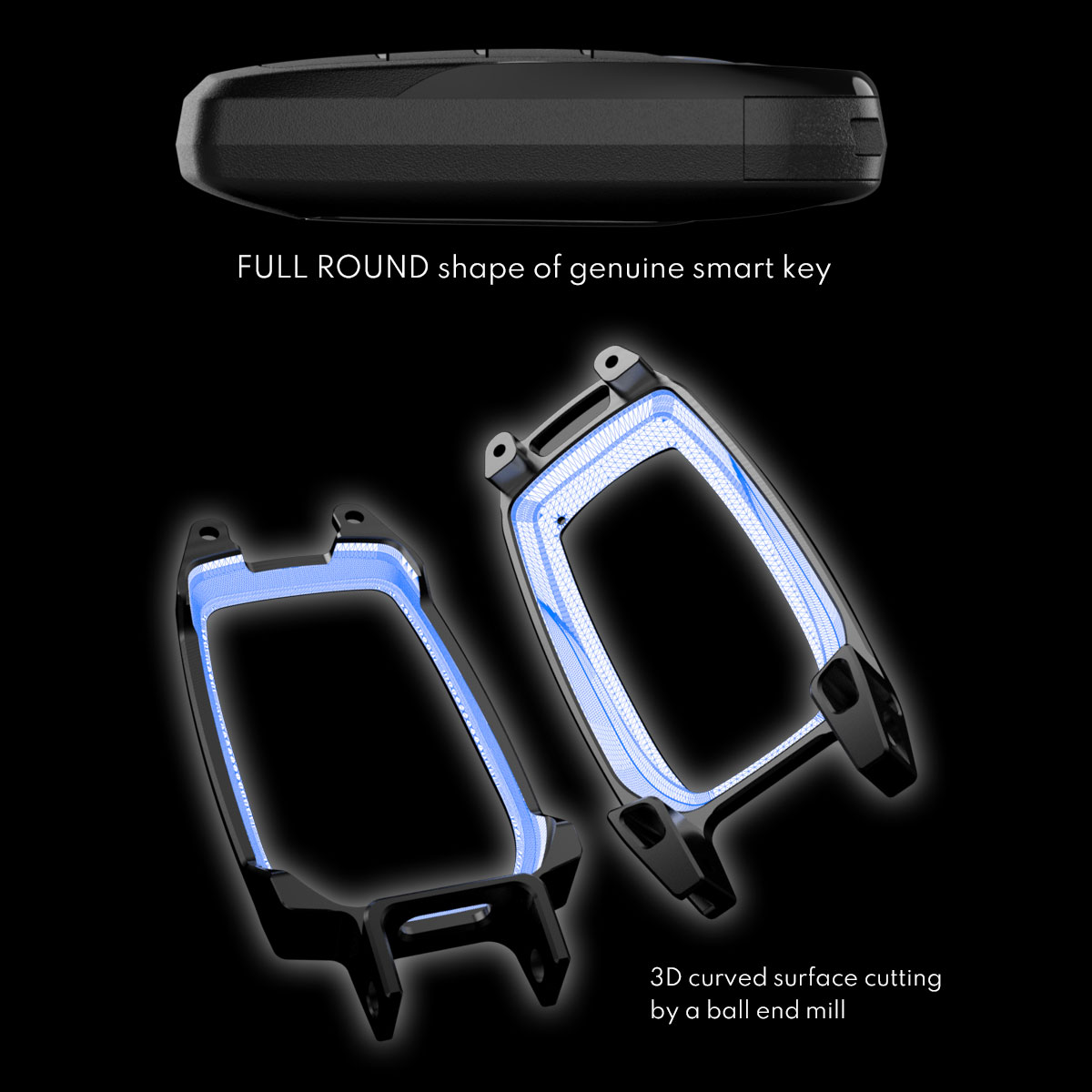 複雑なデザイン形状を持つ純正形状に沿わせて細やかに彫り込んだ3次元内部加工と、強靭なフレーム構造を築くことで、愛車を手放す時まで大切なスマートキーを守り抜きます。