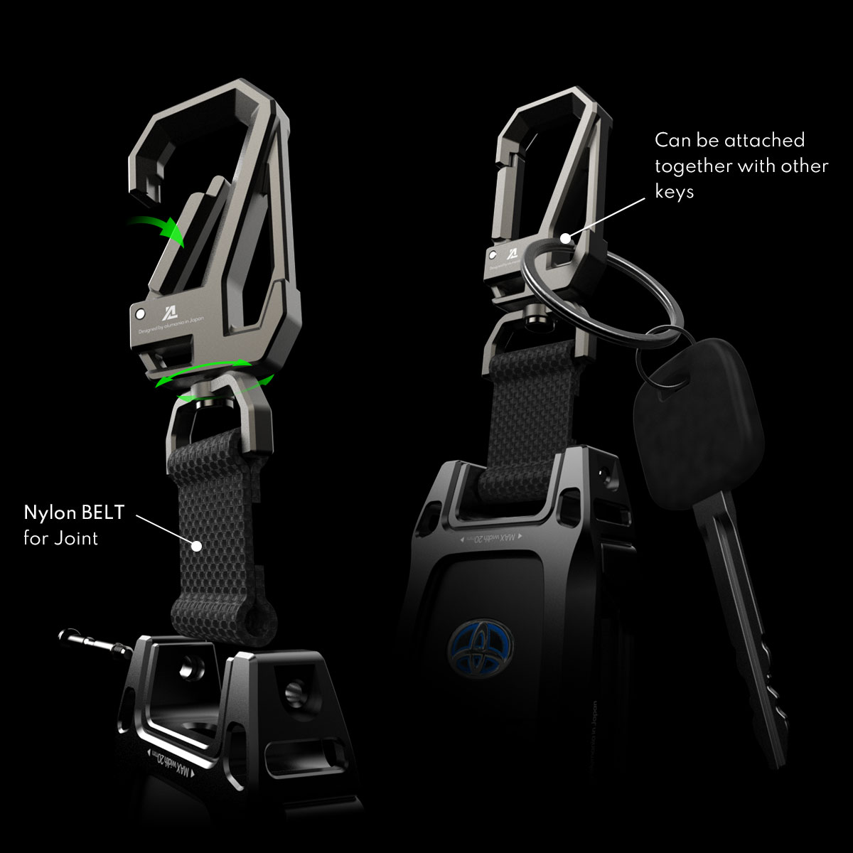 直接接続可能で便利なカラビナ式のキーホルダーを付属しています。フルビレットのバンパーデザインに合わせ、直線を基調としたオリジナルのキーホルダーは、回転機構も持ち合わせており、ボタン操作時も表裏の向きを簡単に変えることができます。