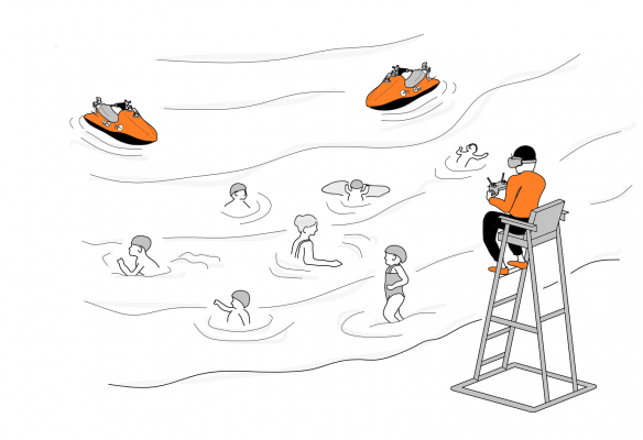 マリンドローンは、水上バイクや小型船舶等をラジコン化し、遠隔操作と自動運転を組み合わせた特許技術「水上監視システム」を搭載した水上ドローンです。マリンドローンやモニター等に設置したカメラの映像を、FPV(First Person View)ゴーグルに投影し、マリンドローンと連動するコントローラーで操縦することが可能です。