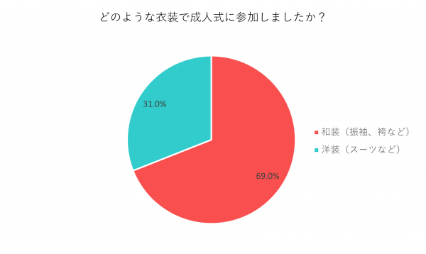 前回は「和装(振袖、袴など)」69.5%、「洋装(スーツなど)」29%、「その他」1.5%でしたが、今回は「和装(振袖、袴など)」69%、「洋装(スーツなど)」31%、「その他」0%という結果に。前回に実施した調査同様、和装で成人式に出席した人が全体の約7割を占めています。