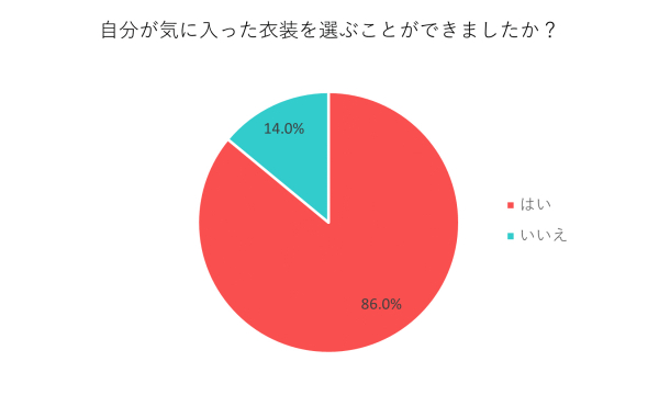 「はい」86%、「いいえ」14%でした。多くの人がお気に入りの衣装を探すことに注力していたことがうかがえます。