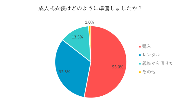 「購入」53%、「レンタル」32.5%、「親族から借りた」13.5%、「その他」1%という結果に。半数以上の人が成人式衣装を購入していることが明らかになりました。