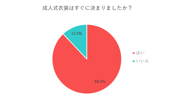 今回実施したアンケート調査によると、2人に1人が成人式衣装を購入していたことが明らかになりました。また、88%が「スムーズに衣装選びできた」と回答しており、「着たい色柄が決まっていたから」「直感的に選んだ」「母が着ていた振袖を着ると決めていたから」といった声が寄せられました。