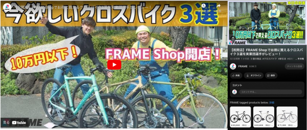 株式会社自転車創業(代表取締役:中島 大 以下、自転車創業)は、株式会社サイクルスポット(代表取締役:鵜池 正貴 以下、サイクルスポット)とApp Unity(株式会社フィードフォース、代表取締役:塚田 耕司)の協力の下、自転車業界では初となるShopifyのYouTubeショッピング連携を2023年6月7日に実装しました。これにより自転車創業運営の国内最大級の自転車YouTubeチャンネル「FRAMEチャンネル」から自転車創業運営のECサイト「FRAME Shop」へのシームレスな購買体験を実現します。