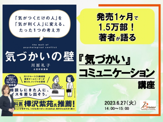 人材育成コンサルティング事業を手掛ける、Brew株式会社(所在地:東京都中央区銀座7丁目13番6号サガミビル2階、代表取締役:原 佳弘)は 、1.5万部「気遣いの壁」著者 川原礼子氏による「気づかいコミュニケーション」オンラインセミナーを6月27日(火)に開催いたします。