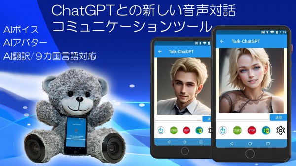 「Talk-ChatGPT &AIテビー」は、 ChatGPTを更に使い易くAIによる新機能を追加し進化させ、PCやスマホに不慣れな方にも簡単にご使用いただけるように、独自にプログラムから開発をした新製品です。